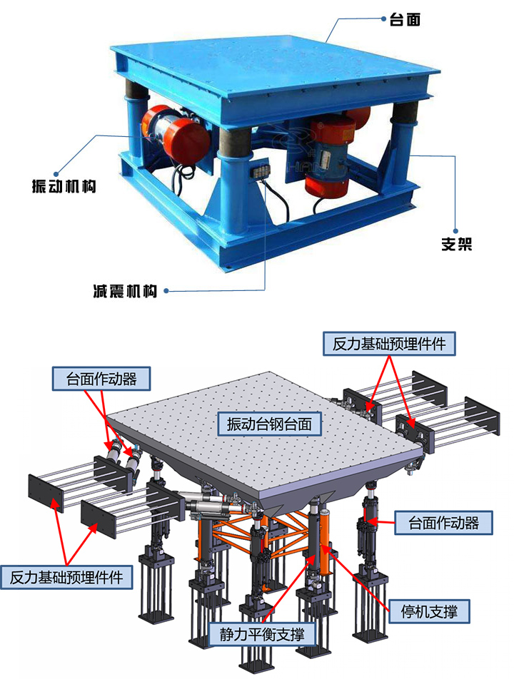 振動(dòng)平臺(tái)主要有支架、臺(tái)面、振動(dòng)機(jī)構(gòu),減震機(jī)構(gòu)四部分組成。