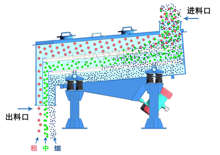 石英砂篩分機利用振動電機激振作為振動源,使物料在篩網上被拋起,同時向前作直線運動,物料從給料機均勻地進入篩分機的進料口,通過多層篩網產生數(shù)種規(guī)格的篩上物、篩下物、分別從各自的出口排出