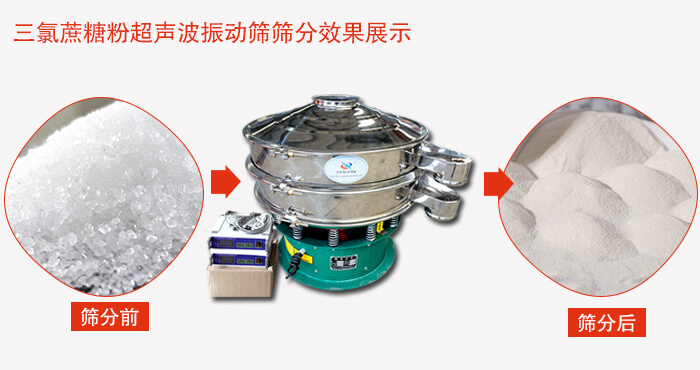 產(chǎn)品簡(jiǎn)介:三氯蔗糖粉超聲波振動(dòng)篩是超聲波技術(shù)與振動(dòng)篩分技術(shù)的有機(jī)結(jié)合,它可以由普通篩分進(jìn)行簡(jiǎn)單的加超聲波系統(tǒng)改造而成,利用超聲波振動(dòng)篩進(jìn)行三氯蔗糖的篩分,能夠減少篩分過程的粉塵污染及產(chǎn)品消耗