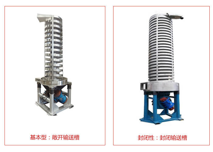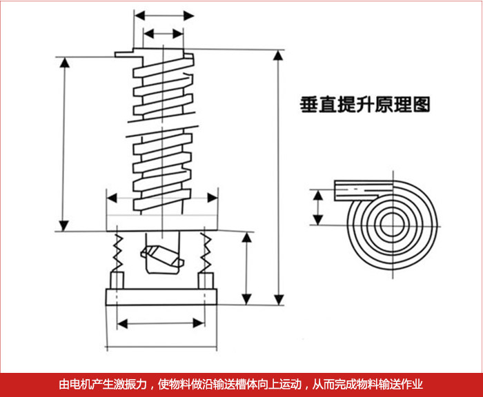 螺旋垂直振動提升機(jī)DZC系列垂直振動輸送機(jī)的驅(qū)動裝置振動電機(jī)安裝在輸送塔下部,兩臺振動電機(jī)對稱交叉安裝,輸送塔由管體和焊接在管體周圍的螺旋輸送槽組成,輸送塔座于減振裝置上,減振裝置由底座和隔振彈簧組成。當(dāng)垂直輸送機(jī)工作時,根據(jù)雙振動電機(jī)自同步原理,由振動電機(jī)產(chǎn)生激振力,強(qiáng)迫整個輸送塔體作水平圓運動和向上垂直運動的空間復(fù)合振動,螺旋槽內(nèi)的物料則受輸送槽的作用,作勻速拋擲圓運動,沿輸送槽體向上運動,從而完成物料的向上(或向下)輸送作業(yè)。
