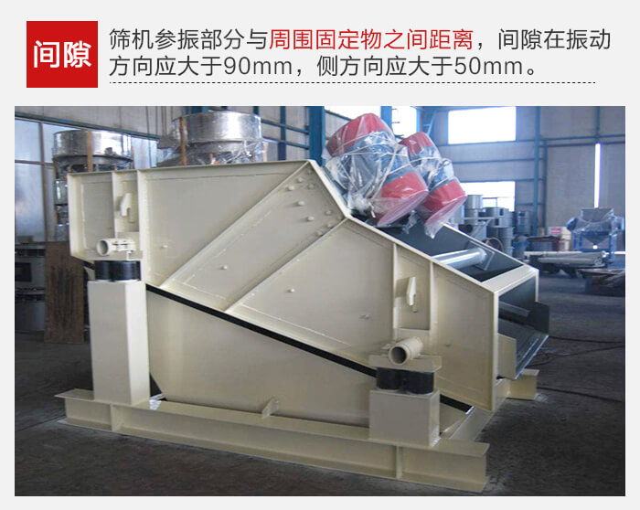 篩機各部分連接必須牢固可靠,所有螺栓不得有松動。篩機上參振部分與周圍固定物之間的間隙在振動方向應(yīng)大于90mm,在側(cè)方向應(yīng)大于50mm.