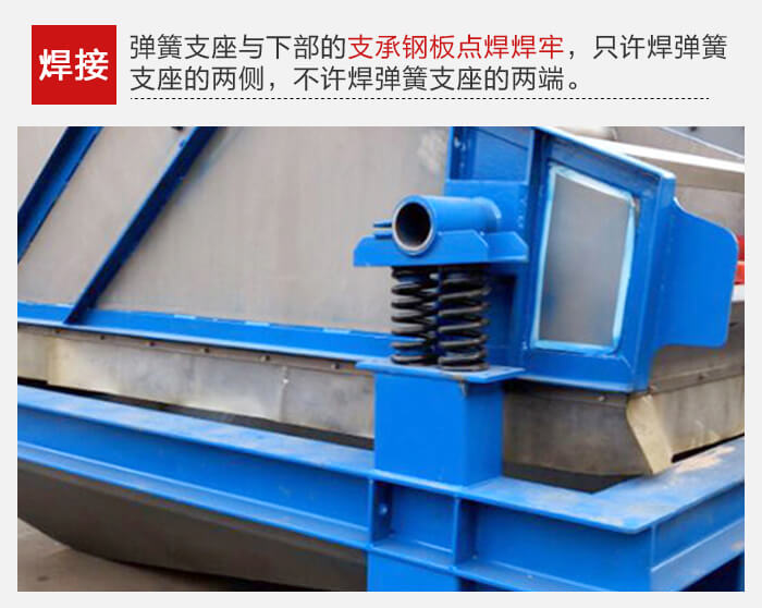 振動器各部分安裝完畢,調(diào)整好相對位置,各處的一次、二次隔振動彈簧均呈垂直狀態(tài)后,把彈簧支座與下部的支承鋼板點焊焊牢。焊接時,只許焊彈簧支座的兩側(cè),不許焊彈簧支座的兩端。