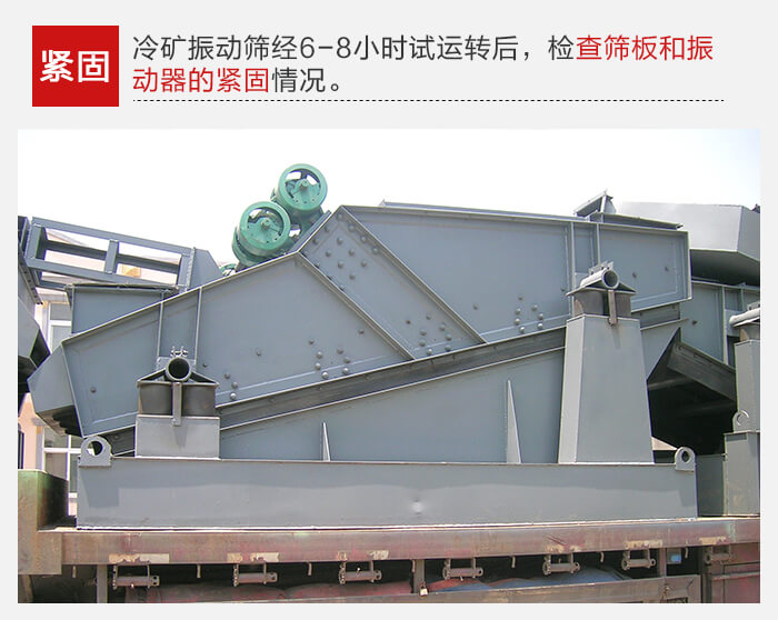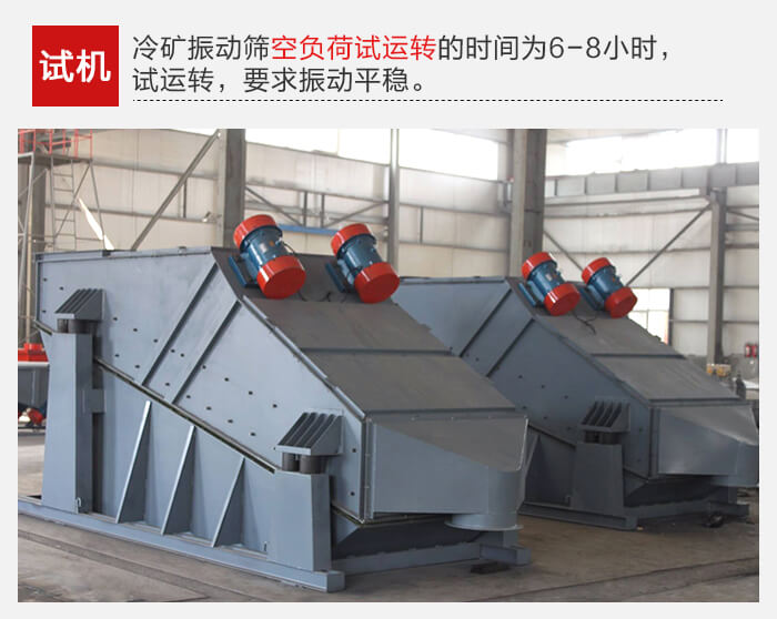 冷礦振動篩空負荷試運轉(zhuǎn)的時間為6-8小時,試運轉(zhuǎn),要求振動平穩(wěn),無橫向擺動及不正常響聲。如發(fā)現(xiàn)上述問題,應(yīng)及時檢查原因,排除故障。